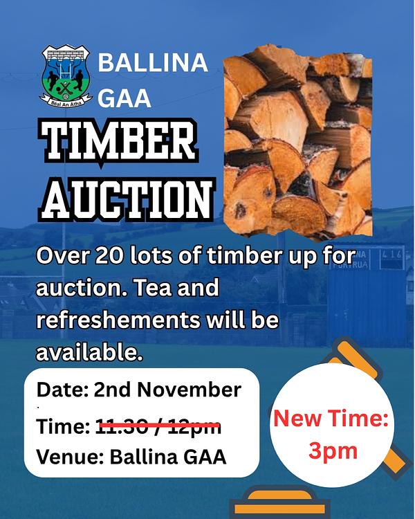 Due to our U21 Team playing Nenagh on Sunday at 12pm, our Timber Auction will now take place at the later time of 3pm. Please share.
